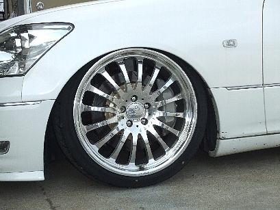 こちらはレクサスLS460 のフロント装着例。 車高の上げ下げの幅は 車種にもよりますが約40mm。 |